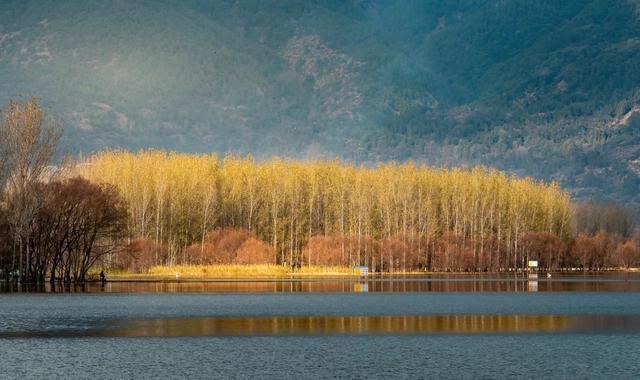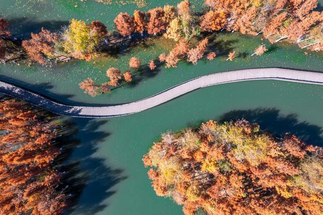 等到深秋,茈碧湖西岸的主角便换成了落羽杉。这些挺拔的树木被秋阳点燃了热情,慢慢褪去绿装,换上浓烈似火的红衣。秋风成了最好的舞伴,轻轻一吹,火红的叶子便纷纷扬扬地飘落,像无数跳跃的小火焰,美得让人屏住呼吸。那一刻站在湖边,你或许会恍惚,分不清眼前这片浓墨重彩的瑰丽,到底是现实,还是一个绮丽的幻梦。