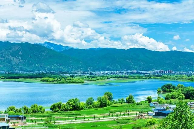 若是沿着平缓的山路往上走一小段,常常在一个不经意的拐角,整个洱源坝子的全景会“唰”地一下撞进你眼里——湖水像孩子随手泼洒的蓝颜料,田野像巨大的绿色格子毯,村庄点缀其间,宛如一幅色彩明快的油画。山风吹过脸庞,好像连衣角都沾上了草木低语的秘密,带着泥土和植物的清新味道。